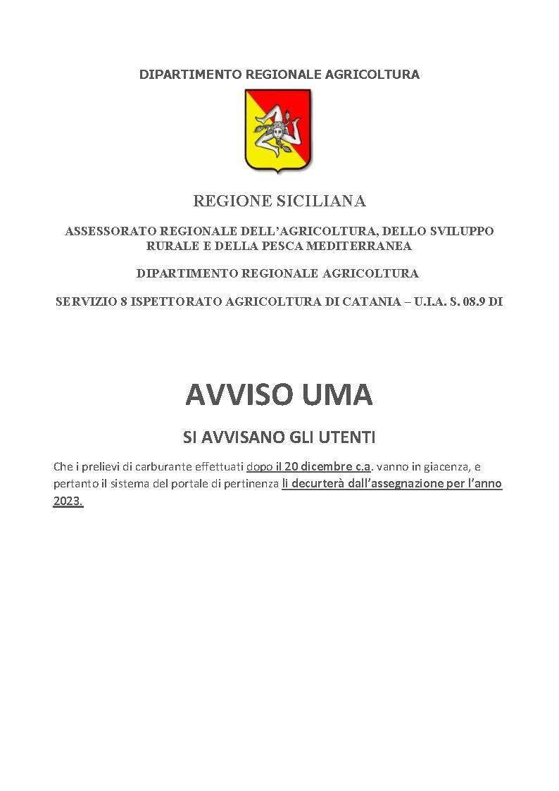 In applicazione del D.D.G. n. 930/2022 del 15/03/2022, si comunica che entro il 30/06/2022 le Ditte in possesso del libretto cartaceo UMA, dovranno provvedere alla consegna dello stesso presso l'Ufficio Regionale di competenza - UIA di Caltagirone - Via Benedetto Scillamà nr. 2 - tel 093323002. Alla Ditta verrà rilasciata attestazione di avvenuto ritiro, utile per la registrazione al Portale Quadrifoglio.