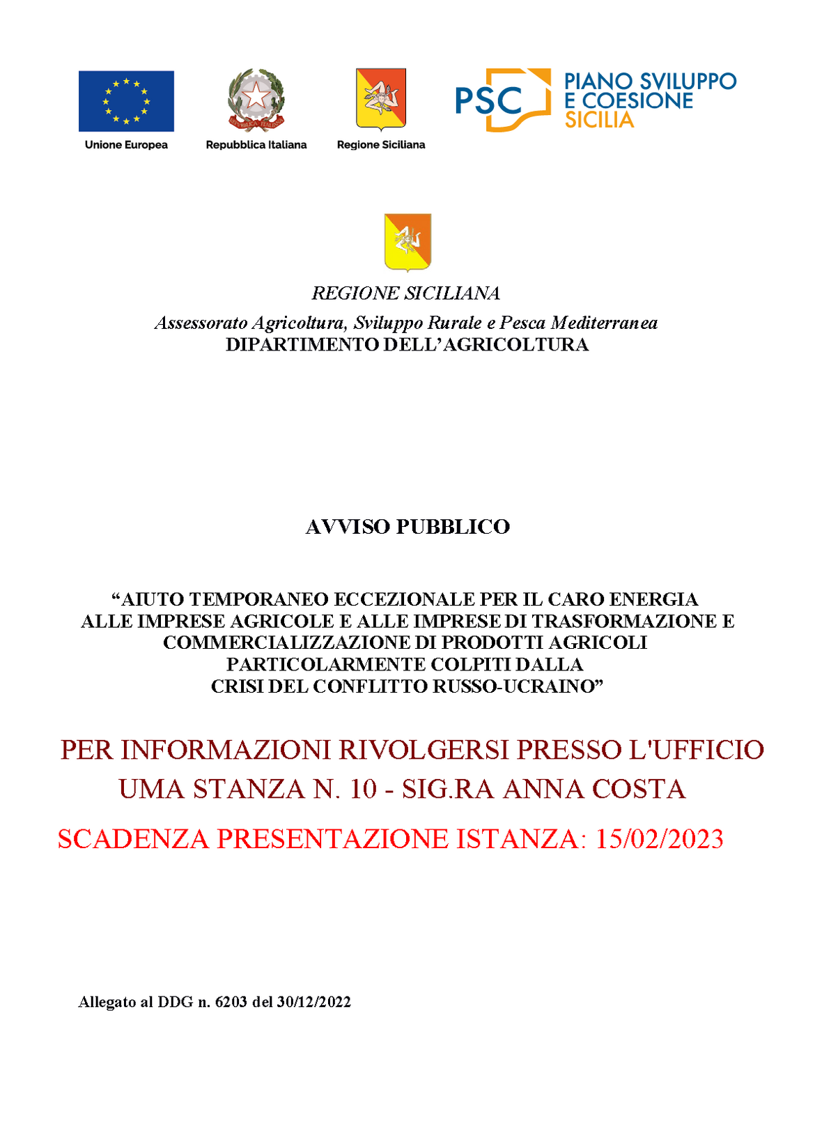 AIUTO TEMPORANEO ECCEZIONALE PER IL CARO ENERGIA ALLE IMPRESE AGRICOLE E ALLE IMPRESE DI TRASFORMAZIONE E COMMERCIALIZZAZIONE DI PRODOTTI AGRICOLI PARTICOLARMENTE COLPITI DALLA CRISI DEL CONFLITTO RUSSO-UCRAINO - SCADENZA 15/02/2023