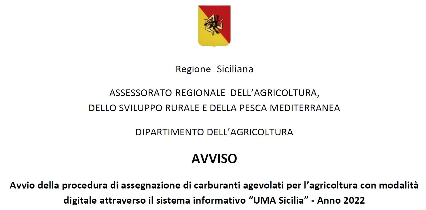 AVVISO - Avvio della procedura di assegnazione di carburanti agevolati per l'agricoltura con modalità digitale attraverso il sistema informativo UMA Sicilia https://quadrifoglio.regione.sicilia.it - Anno 2022
