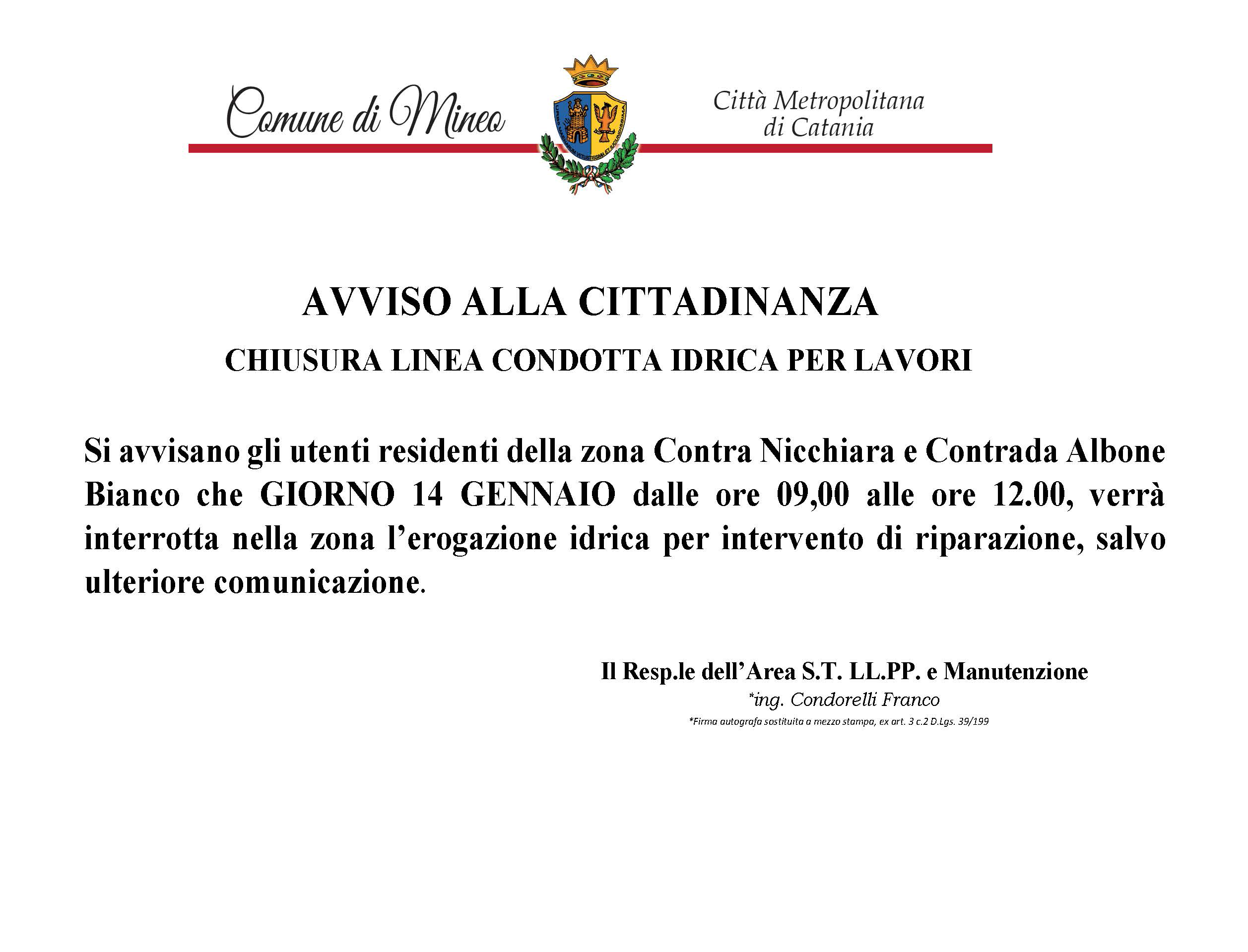 AVVISO CHIUSURA LINEA CONDOTTA IDRICA PER LAVORI ZONA CONTRADA ALBONE BIANCO E NICCHIARA PER LA GIORNATA DEL 14 gennaio 2023 DALLE ORE 09.00 ALLE ORE 12.00