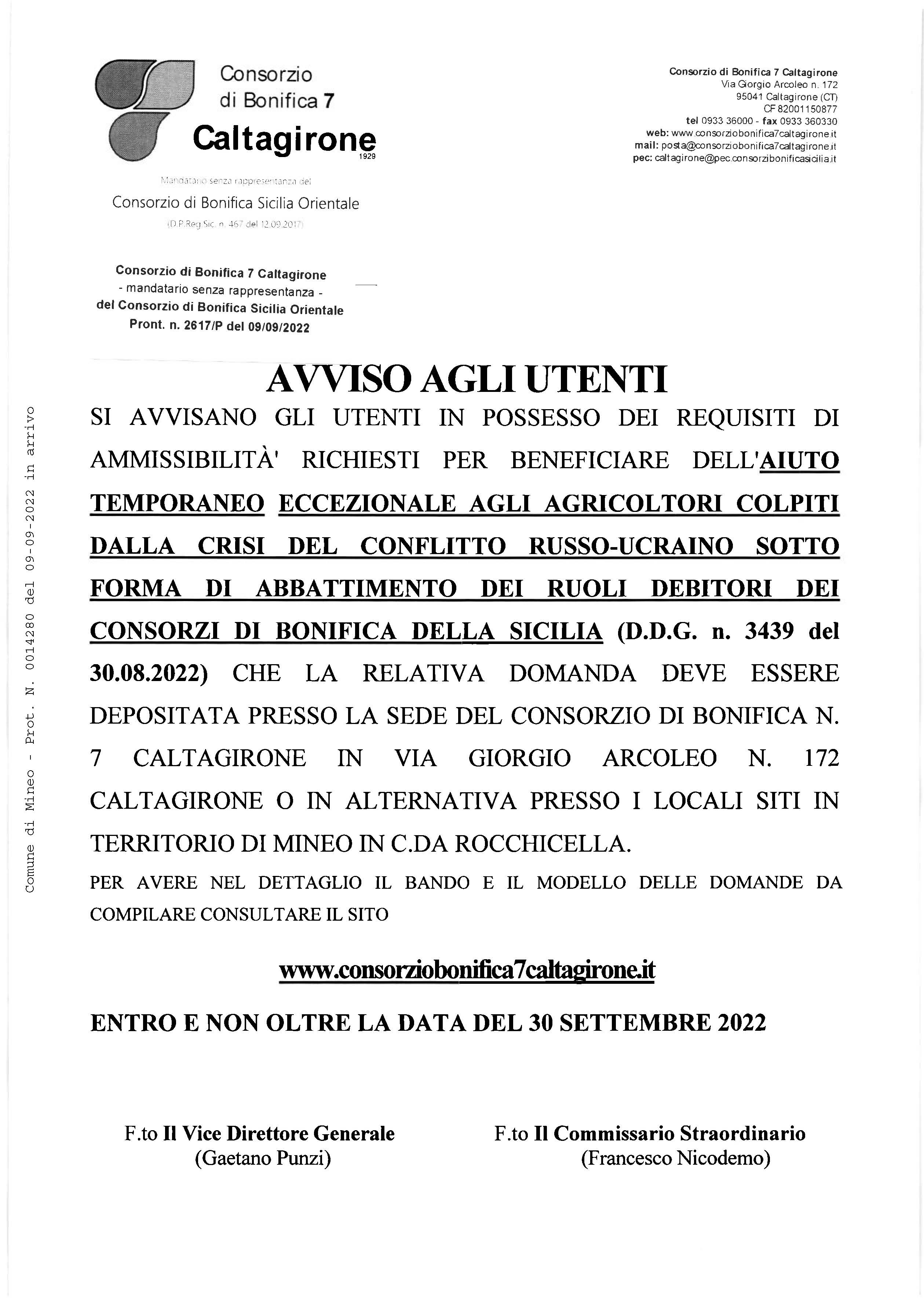 AVVISO Consorzio di Bonifica 7 Caltagarone - D.D.G. N. 3439 DEL 30.08.2022. AIUTO TEMPORANEO ECCEZIONATE AGLI AGRICOLTORI COLPITI DALLA CRISI DEL CONFLITTO RUSSO UCRAINO SOTTO FORMA DI ABBATTIMENTO DEL RUOLO DEBITORI DEI CONSORZI. Scadenza 30.09.2022.