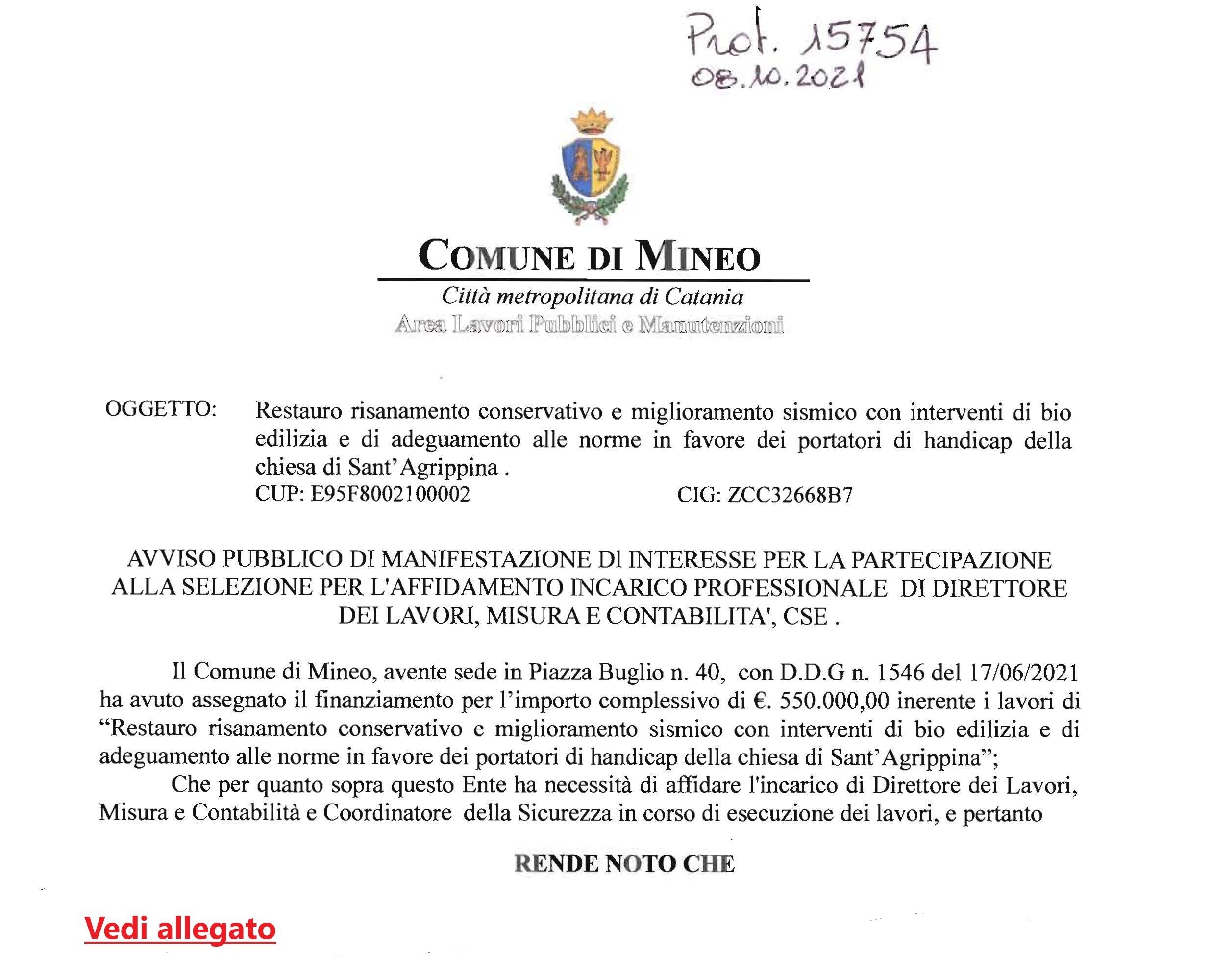 AVVISO PUBBLICO DI MANIFESTAZIONE Dl INTERESSE PER LA PARTECIPAZIONE ALLA SELEZIONE PER L'AFFIDAMENTO INCARICO PROFESSIONALE DI DIRETTORE DEI LAVORI, MISURA E CONTABILITA', CSE. Lavori chiesa di S. Ag...