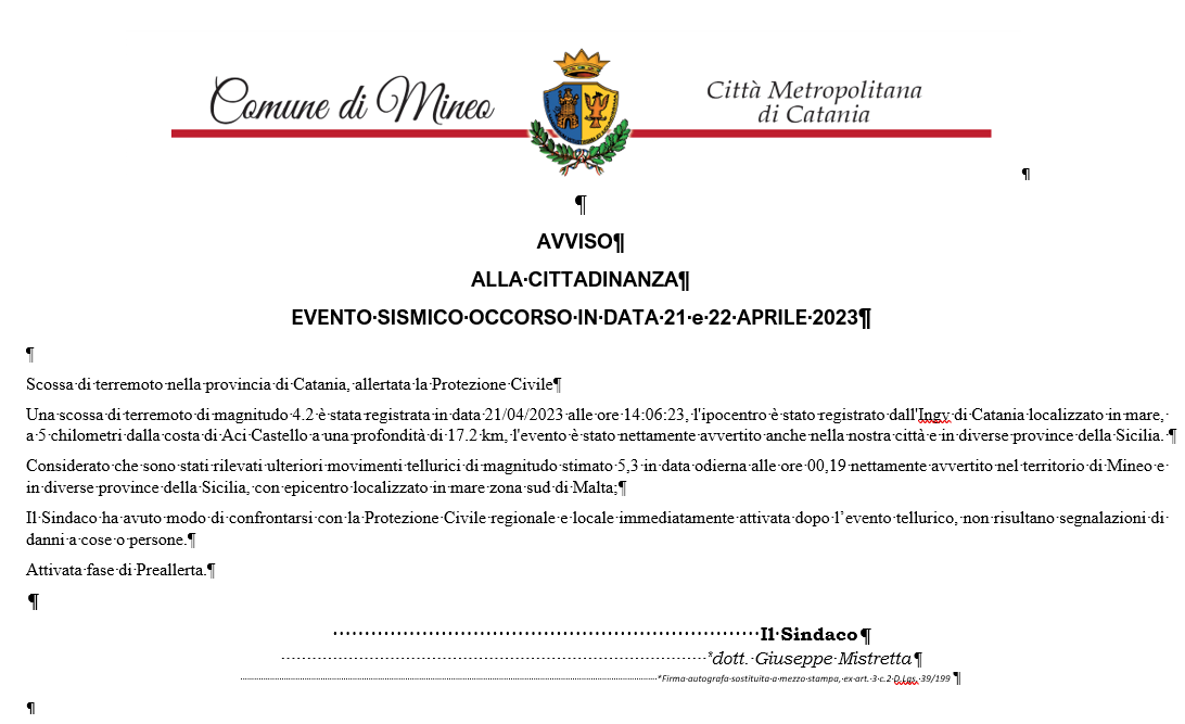 Documenti File allegati 2023 04 22 03 04 36 Immagine 2023 04 22 030413 (File image/png 92,10 kB) 2023 04 22 03 07 10 Avviso preallerta sisma 21 22 aprile 2023 (File pdf 234,68 kB) 2023 04 22 09 02 49 Prot Par 0006575 del 22 04 2023 Documento O.S. 24 attivazione C.O.C. (File pdf 134,40 kB) 2023 04 22 03 07 10 banner lista terremoti (File image/jpeg 58,80 kB)