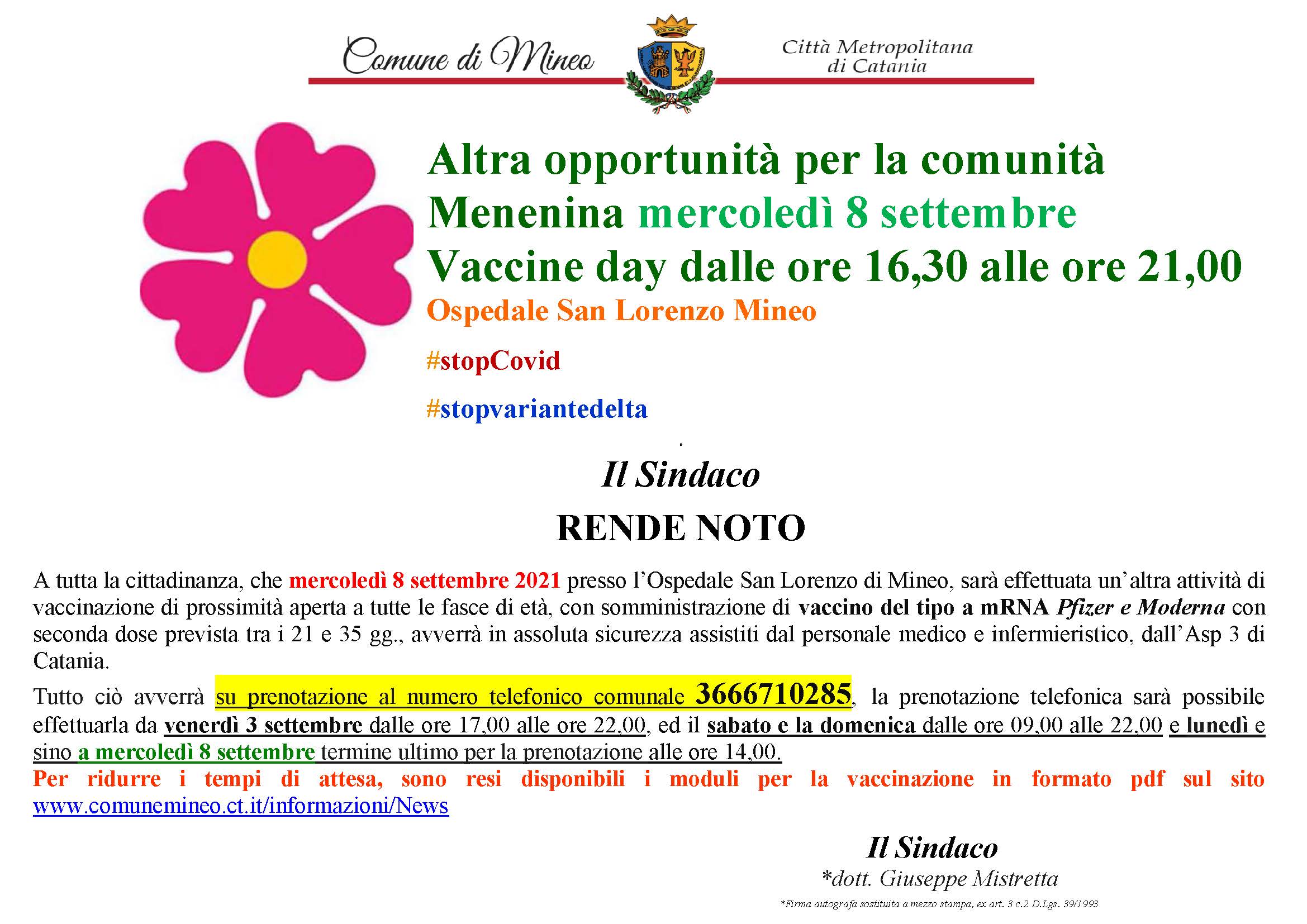 Avviso Covid 19 - Altra opportunità  per la comunità  Menenina mercoledì - 8 settembre Vaccine day dalle ore 16,30 alle ore 21,00