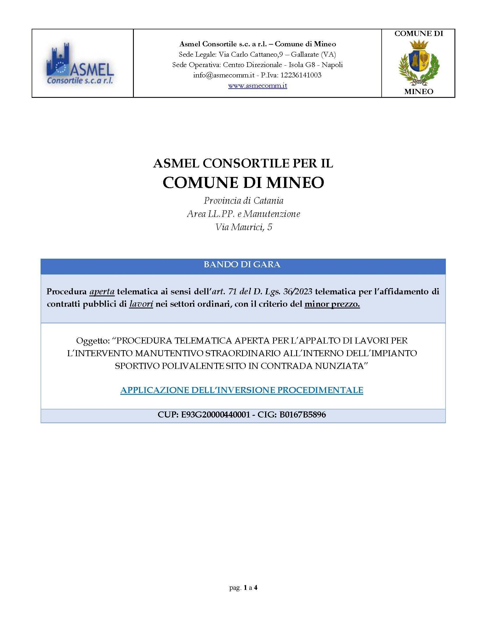 Avviso - Verbali n. 1 e n. 2 - Procedura aperta telemetica art. 71 D.lgs. 36/2023 CUP: E93G20000440001 - CIG: B0167B5896 - Attività Sportive - DDG n. 3755 del 29.12.2023 - FUNT 2022 Mineo - Visualizza...