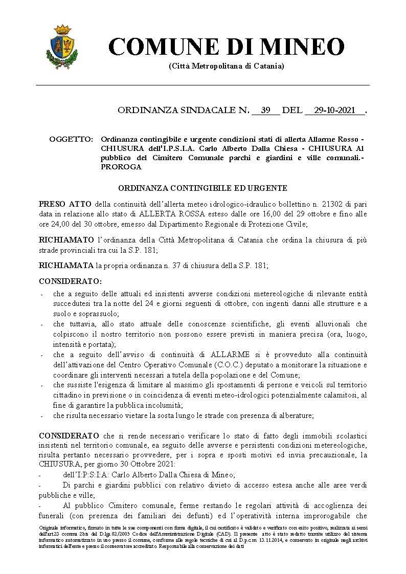 ORDINANZA SINDACALE N.39 Ordinanza contingibile e urgente condizioni stati di allerta Allarme Rosso - CHIUSURA dell'I.P.S.I.A. Carlo Alberto Dalla Chiesa - CHIUSURA Al pubblico del Cimitero Comunale p...