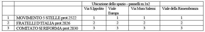 Sempre con Delibera di Giunta Municipale n. 12 c.m. sono stati assegnati gli spazi ai partiti e comitati richiedenti, secondo la norma della Legge 212/1956 ss.mm.ii., secondo l’ordine di protocollo: