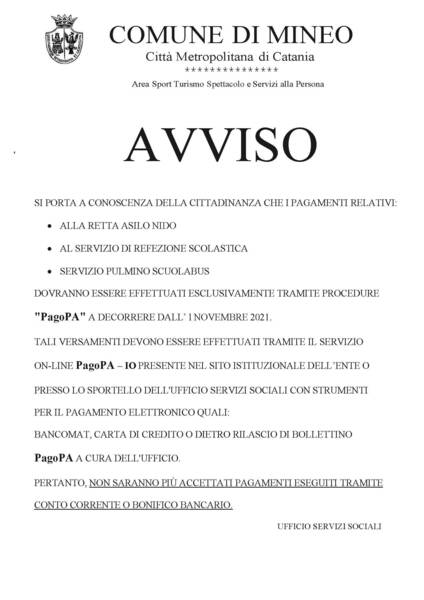 I PAGAMENTI RELATIVI: ALLA RETTA ASILO NIDO, AL SERVIZIO DI REFEZIONE SCOLASTICA, SERVIZIO PULMINO SCUOLABUS DOVRANNO ESSERE EFFETTUATI ESCLUSIVAMENTE TRAMITE PROCEDURE "PagoPA"