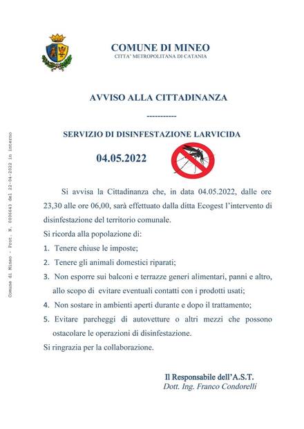 AVVISO ALLA CITTADINANZA SERVIZIO DISINFESTAZIONE LARVICIDA 04.05.2022