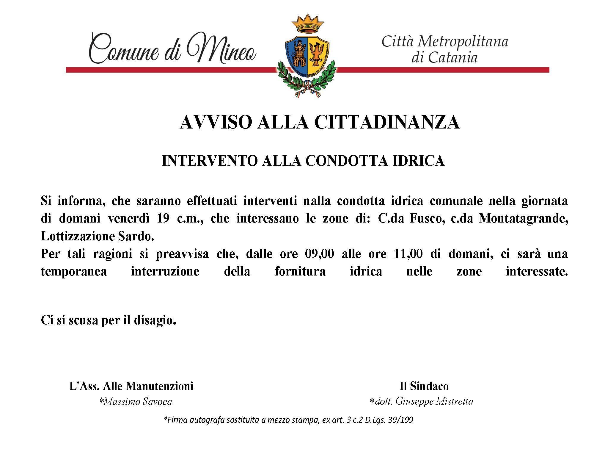 Si informa, che saranno effettuati interventi nalla condotta idrica comunale nella giornata di domani venerdì 19 c.m., che interessano le zone di: C.da Fusco, c.da Montatagrande, Lottizzazione Sardo. Per tali ragioni si preavvisa che, dalle ore 09,00 alle ore 11,00 di domani, ci sarà una temporanea interruzione della fornitura idrica nelle zone interessate.