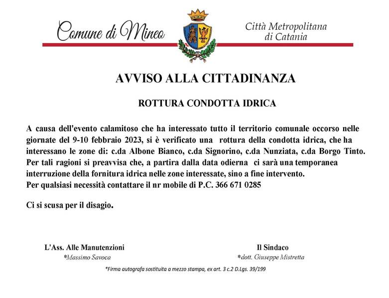 AVVISO - Temporanea interruzione della fornitura idrica nelle zone interessate di c.da Albone Bianco, c.da Signorino, c.da Nunziata, c.da Borgo Tinto, sino a fine intervento - Rottura Condotta idrica