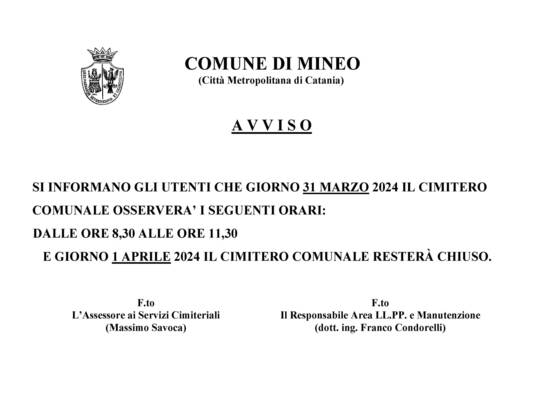 Avviso - Si informano gli utenti che giorno 31 marzo 2024 il cimitero comunale osservera’ i seguenti orari: dalle ore 8,30 alle ore 11,30 e giorno 1 aprile 2024 il cimitero comunale resterà chiuso.