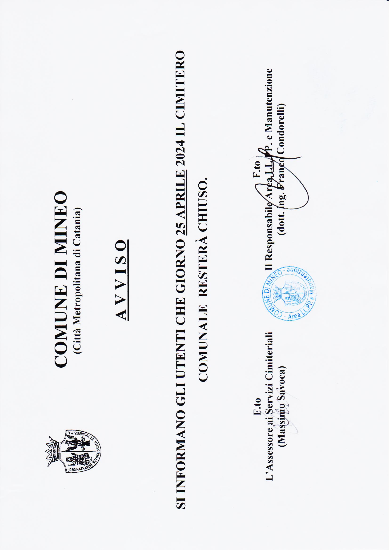 Descrizione Avviso - Si informano gli utenti che per le festività a calendario del 25 aprile e 1° maggio c.a. il civico cimitero resterà chiuso.