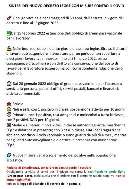 Documenti File allegati 2021 12 31 13 15 14 DECRETO LEGGE 24 dicembre 2021, n. 221 (File pdf 1,73 MB) 2022 01 06 21 56 51 AGGIORNAMETO REGOLE 31 DIC. 2021 (File pdf 375,25 kB) 2021 12 31 13 19 11 OMICRON (File pdf 53,45 kB) 2021 12 31 13 21 31 circolare ministero (File pdf 412,60 kB) 2022 01 06 20 06 36 decreto legge 30 dic 2021 n 229 (File pdf 148,94 kB) 2022 01 11 22 52 22 Circolare del Ministero della Salute ed Istruzione del 8 Gennaio 2022 1 (File pdf 744,95 kB) 2022 01 21 22 36 32 DECRETO LEGGE 7 GENNAIO 2022 N. 1 (File pdf 248,65 kB) 2022 01 21 21 35 51 DPCM 21 GENNAIO 2022 (File pdf 3,60 MB)