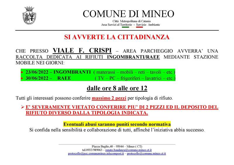 RACCOLTA DEDICATA AI RIFIUTI RAEE MEDIANTE STAZIONE MOBILE PRESSO VIALE F. CRISPI 30 giugno 2022