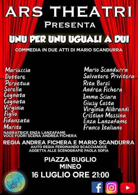 Ars Theatri presenta commedia in due atti giorno 16 luglio c.a. ore 21,00 P.zza Buglio, 40 UNU PER UNU UGUALI A DUI di Mario Scandurra